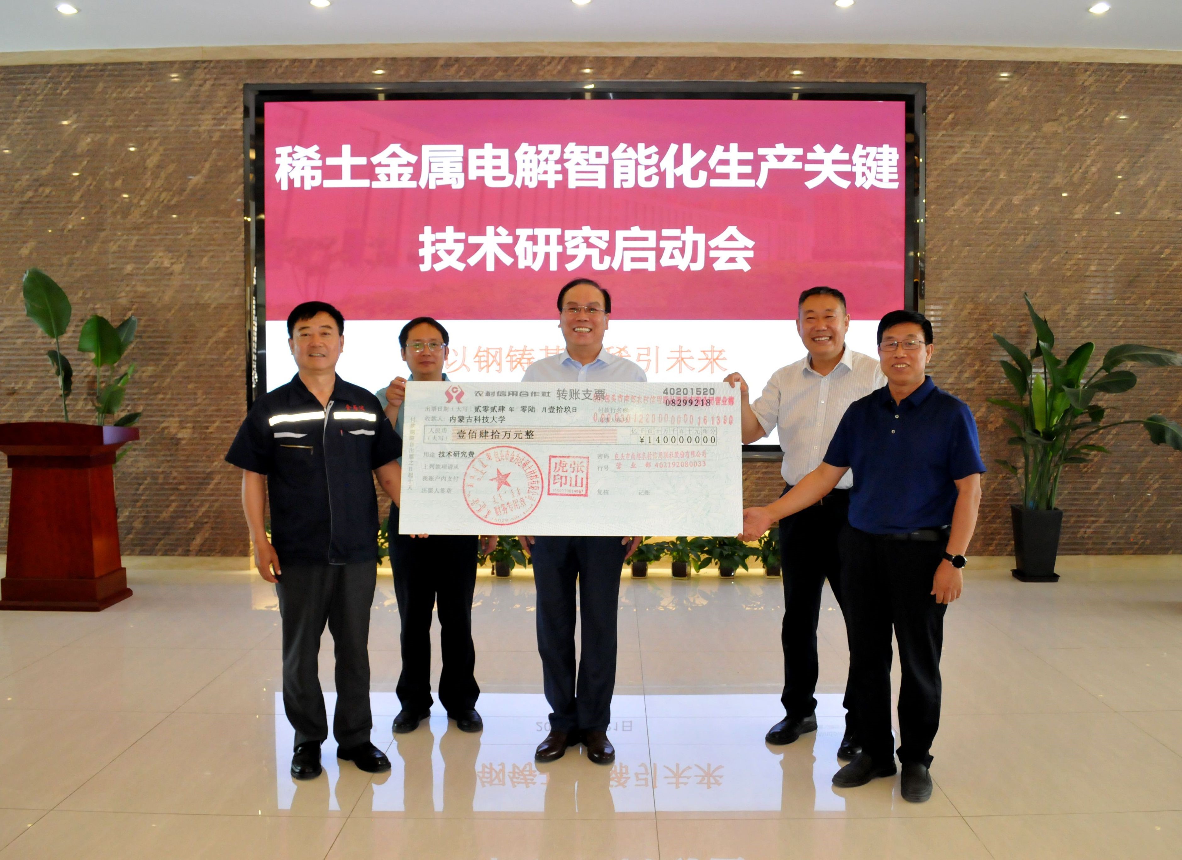 张山虎公司的支持表示感谢,并介绍了金为达企业的基本情况,表示伟德国际1946bv行业服务能力强、贡献度高,在人才培养和科研水平有较强的实力。愿意与伟德国际1946bv展开项目合作,并现场与bevitor伟德国际1946签署“稀土金属电解智能化生产关键技术项目”,移交项目转账支票140万元整。